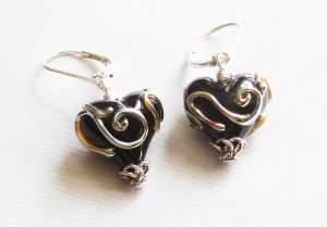 728.g Metallic swirl black heart drop earrings