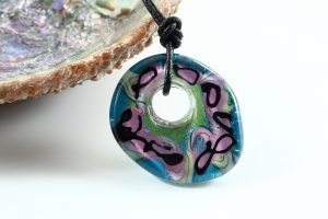 9100 Painted Big Hole Disc Teal Pink Abstract Flowers Disc on Leather Cord AB