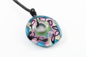 9100 Painted Big Hole Disc Teal Pink Abstract Flowers Disc on Leather Cord